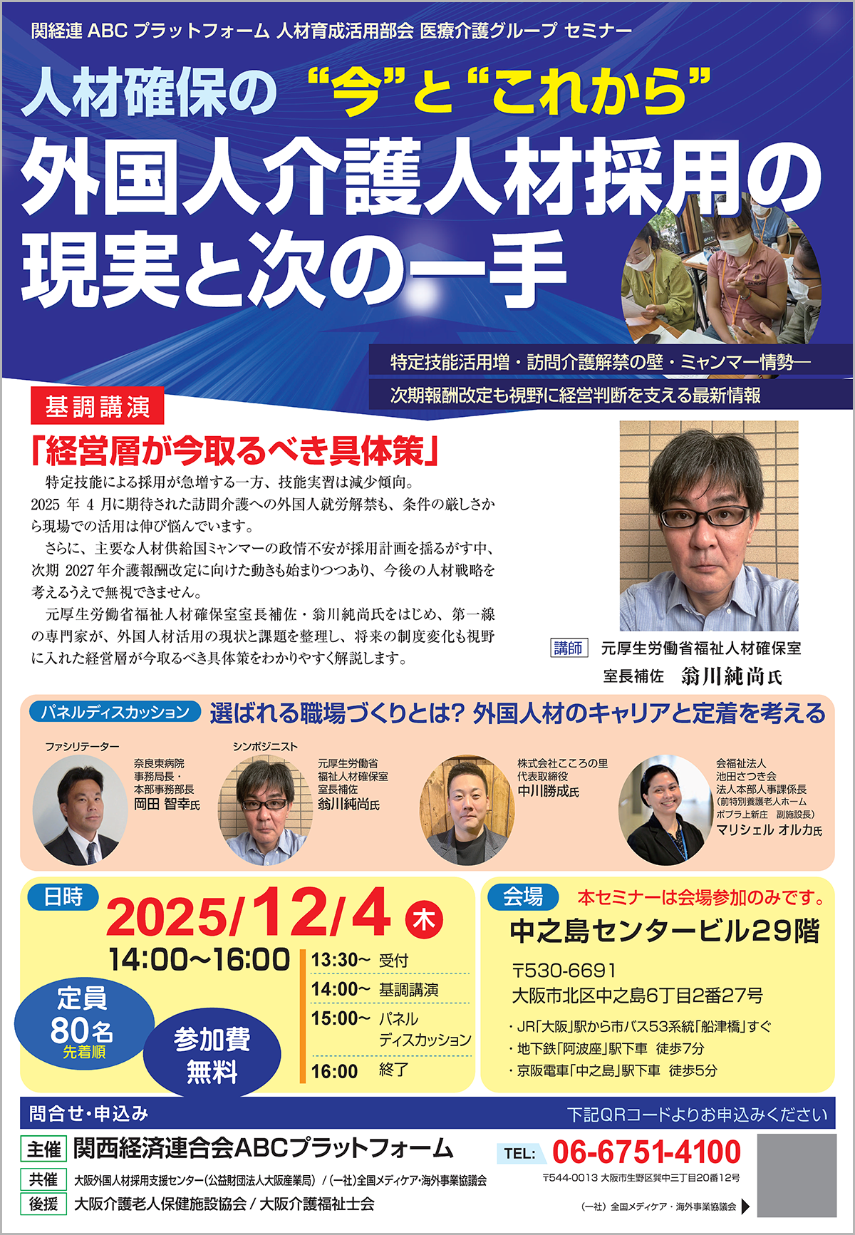 介護現場では、人材不足が深刻化するなか、外国人材の活用が重要な選択肢となっています。しかし、制度の複雑さや受け入れ体制の整備、人材定着の難しさなど、「導入を進めたいのに、なかなかうまくいかない」という声も少なくありません。こうした状況を踏まえ、本セミナーでは、外国人介護人材の活用に関する最新動向を整理し、経営判断のヒントとなる具体的な視点をお伝えします。セミナーは基調講演とパネルディスカッションの2部構成となっています。元厚生労働省福祉人材確保室室長補佐 翁川 純尚 氏をお招きして、「経営層が今取るべき具体策」を軸に、今取るべき具体策をわかりやすく解説していただきます。また、シンポジウムでは、第一線の専門家が、外国人材活用の現状と課題を整理し、将来の制度変化も視野に入れた経営層が、「選ばれる職場づくりとは? 外国人材のキャリアと定着を考える」について語り合います。本セミナーは無料・事前申込制(定員80名・先着順)です。お席に限りがございますので、関心をお持ちの方はお早めにお申し込みください。